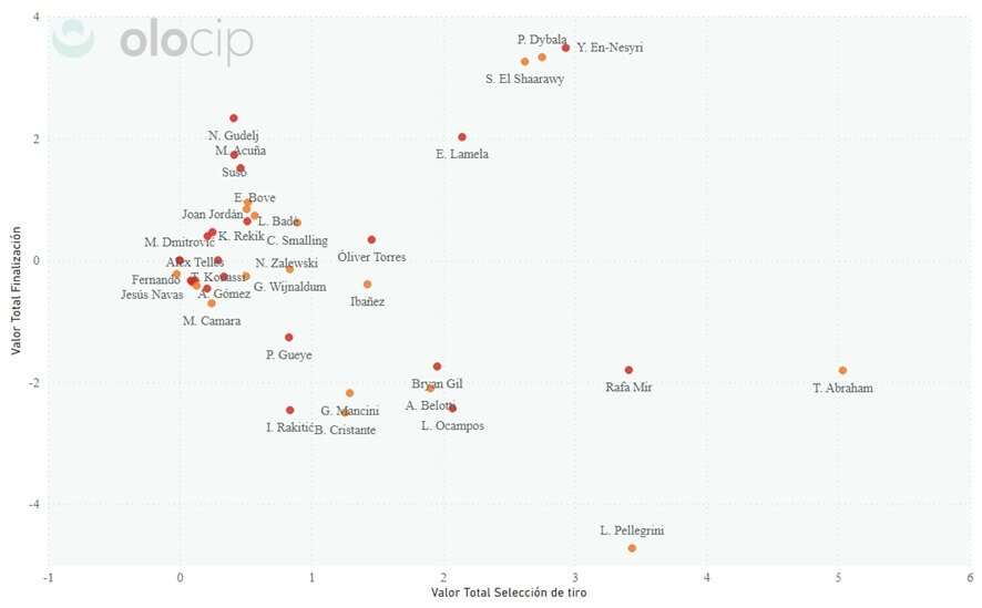 Si analizamos el rendimiento de los jugadores por la calidad de sus acciones sumando las competiciones nacionales (LaLiga + Serie A) y la Europa League, el jugador más destacado de la Roma es Dybala y del Sevilla, Gudelj.