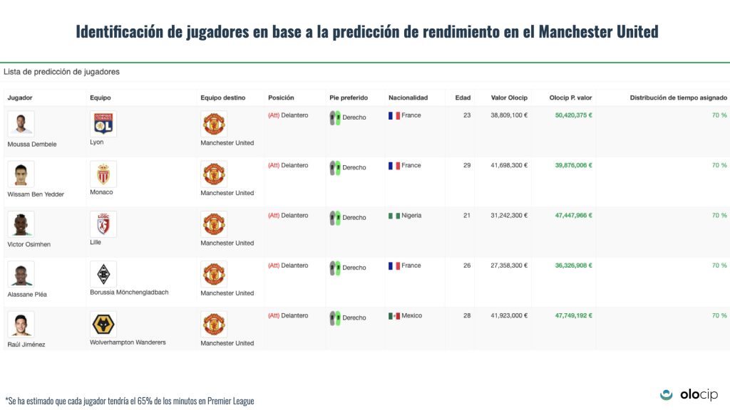 En Olocip, hemos seleccionado algunos arietes del panorama internacional que el equipo inglés tiene en su agenda y a través de la inteligencia artificial podemos realizar una predicción de rendimiento de cada uno de esos jugadores si ficharan por el United para la próxima temporada. Esta comparación está validada científicamente y sitúa a cada jugador en su posible nuevo club (ManU), con nuevos compañeros, entrenador, posiblemente liga, etc.