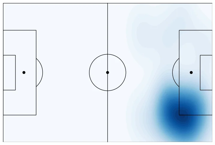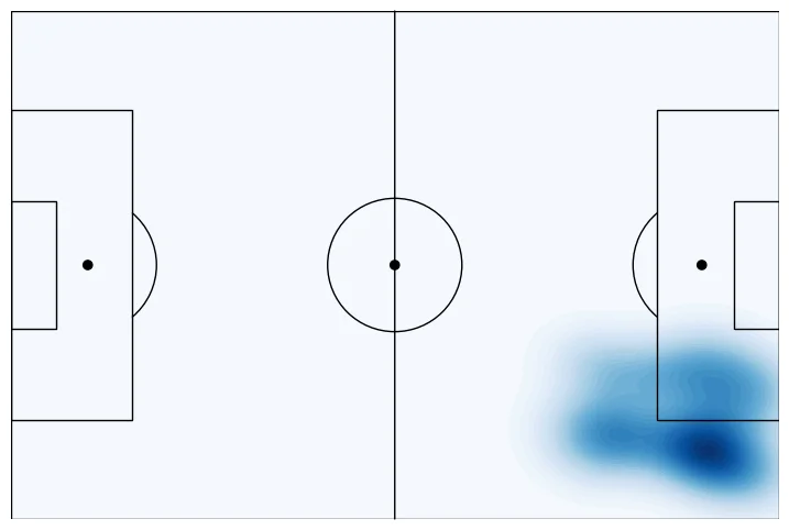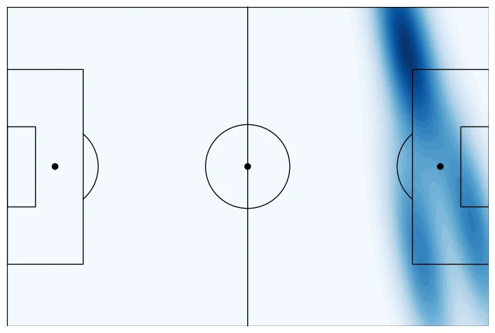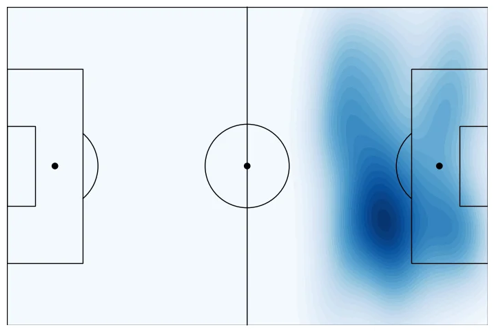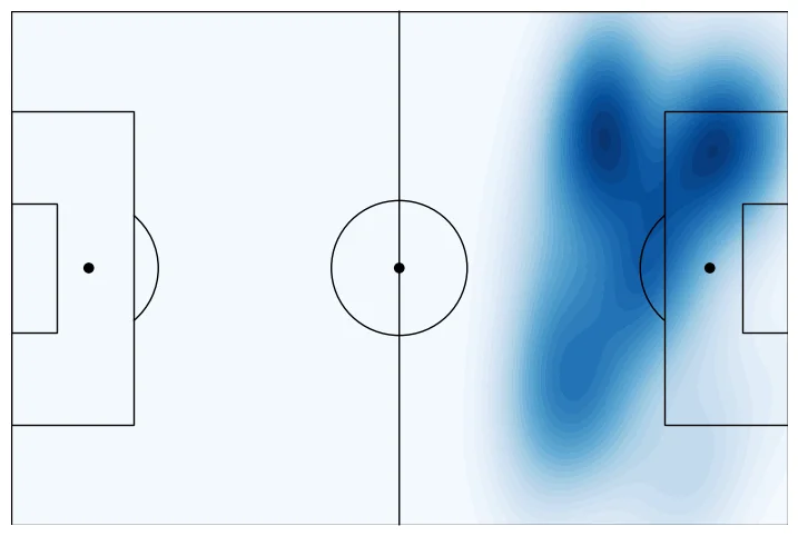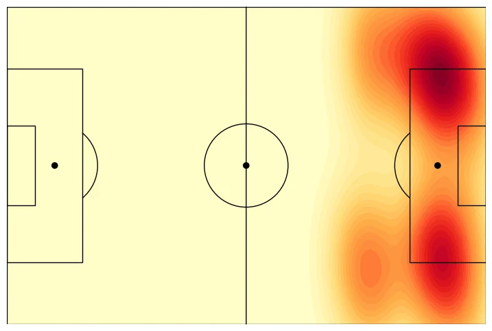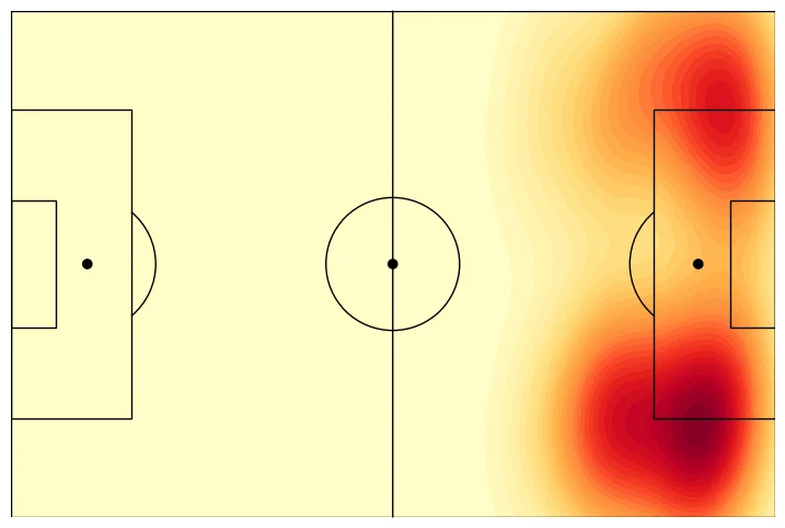 En contraste, el FC Barcelona presenta una tendencia clara hacia la banda derecha, donde se concentra la mayor cantidad de centros y también se genera un valor ofensivo superior. La mayoría de sus acciones más peligrosas provienen de esta zona, destacando la importancia de los envíos desde la derecha y también en el borde del área.