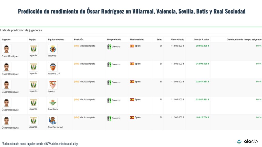 Otra de las preguntas que se hace un club cuando hace un fichaje es si el jugador se va a revalorizar jugando en su equipo. El modelo predictivo de Olocip, tras otorgar que Óscar Rodríguez participaría en el 60% de los minutos en cada uno de estos equipos (Villarreal, Valencia, Sevilla, Betis y Real Sociedad), indica que el mediocampista se revalorizaría más si jugase en el equipo valencianista, pasando de un valor actual de alrededor de 11,5 millones de euros a aproximadamente 24,5 millones a final de temporada si finalmente fichase por el conjunto ché.