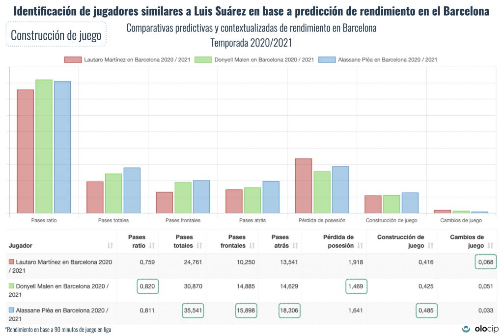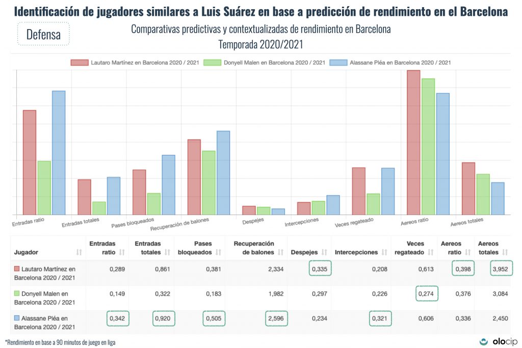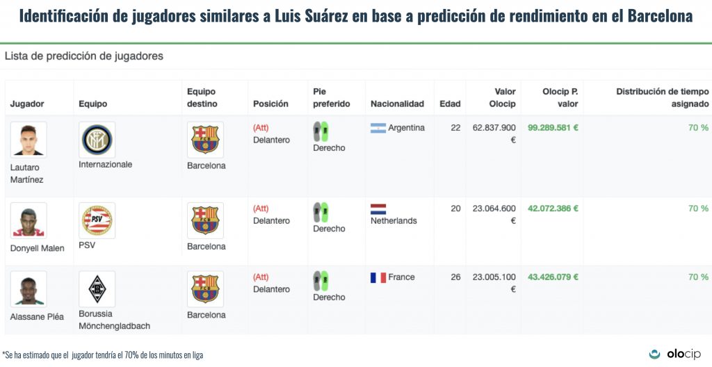 Así, teniendo en cuenta los criterios expuestos anteriormente en la búsqueda de un recambio para Luis Suárez para la temporada 2020/21 en el conjunto blaugrana, los jugadores identificados por la herramienta de Scouting de Olocip son: Lautaro Martínez (Inter), Donyell Malen (PSV) y Alassane Pléa (Borussia Mönchengladbach).