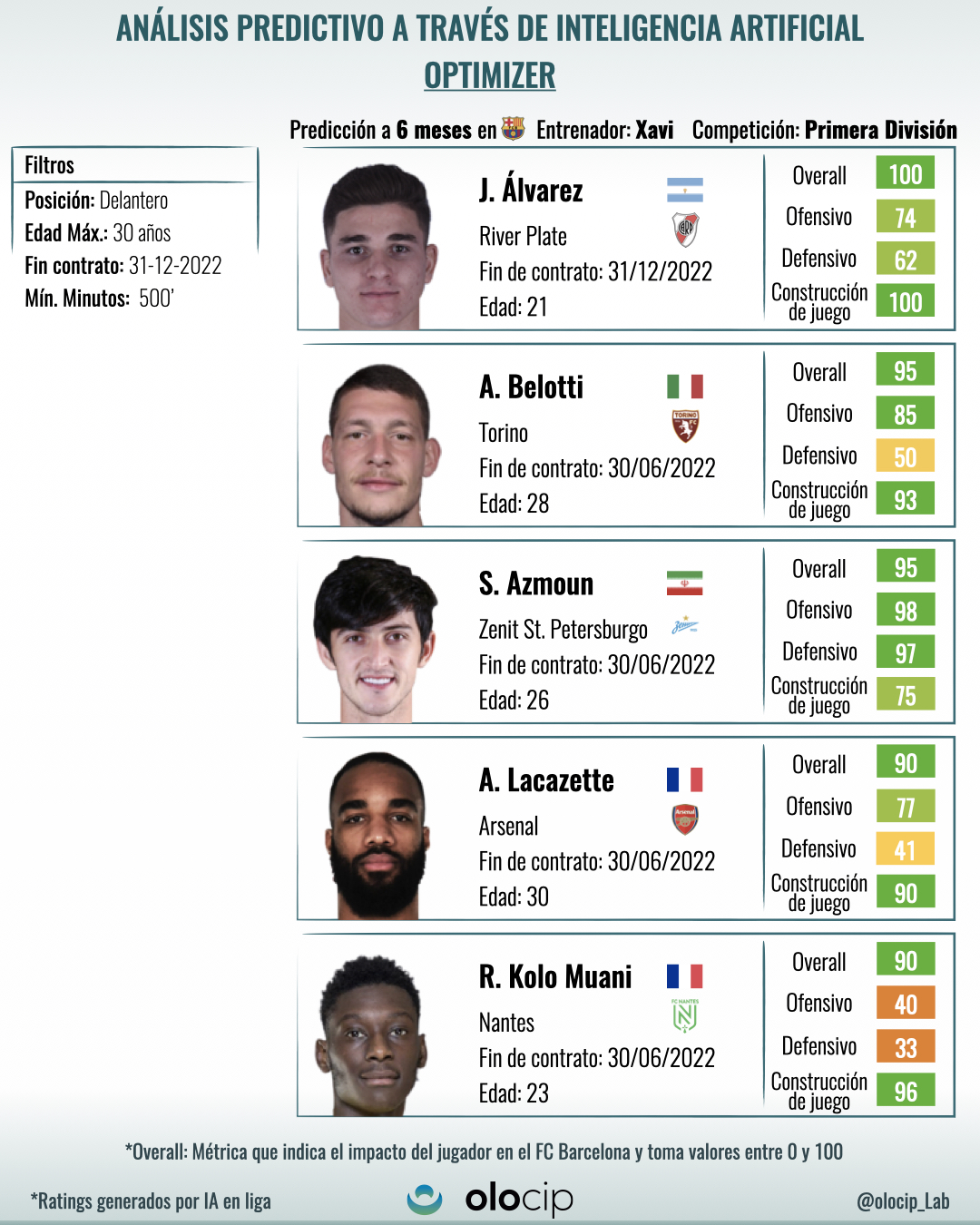 En este sentido los jugadores seleccionados por la inteligencia artificial, de entre más de 1400 delanteros, son: Julián Álvarez (River Plate), Andrea Belotti (Torino), Sardar Azmoun (Zenit de San Petersburgo), Alexandre Lacazette (Arsenal) y Kolo Muani (Nantes).
