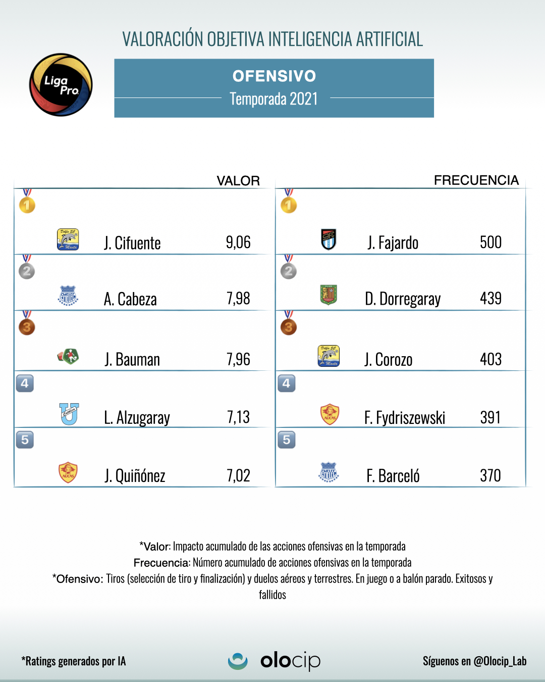 Para elegir a los mejores talentos jóvenes de la liga de Ecuador hemos puesto un filtro de hasta jugadores nacidos en 1998. Según la inteligencia artificial, el jugador menor de 23 años que mayor impacto ha tenido durante las 30 jornadas disputadas ha sido Jhonny Quiñónez (23 años). Además, ha sido el 3º mejor jugador de todo el torneo. El pivote de la SD Aucas ha acumulado un valor de +11,27 (7,02 ofensivo + 3,82 construcción de juego + 0,43 defensivo) en 1830 minutos disputados.