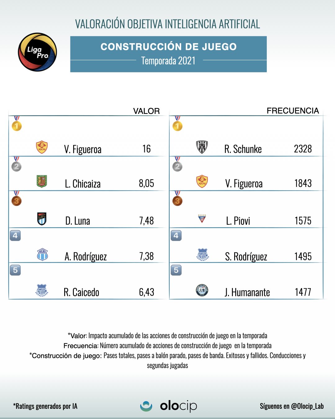 El mediocampista argentino de la SD Aucas, Víctor Figueroa, es el jugador con mayor valor acumulado con sus acciones y por tanto el MVP de la Serie A de Ecuador durante la fase regular de la temporada. Tiene un valor acumulado de 19,7 (3 ofensivo + 16 construcción de juego + 0,73 defensivo)