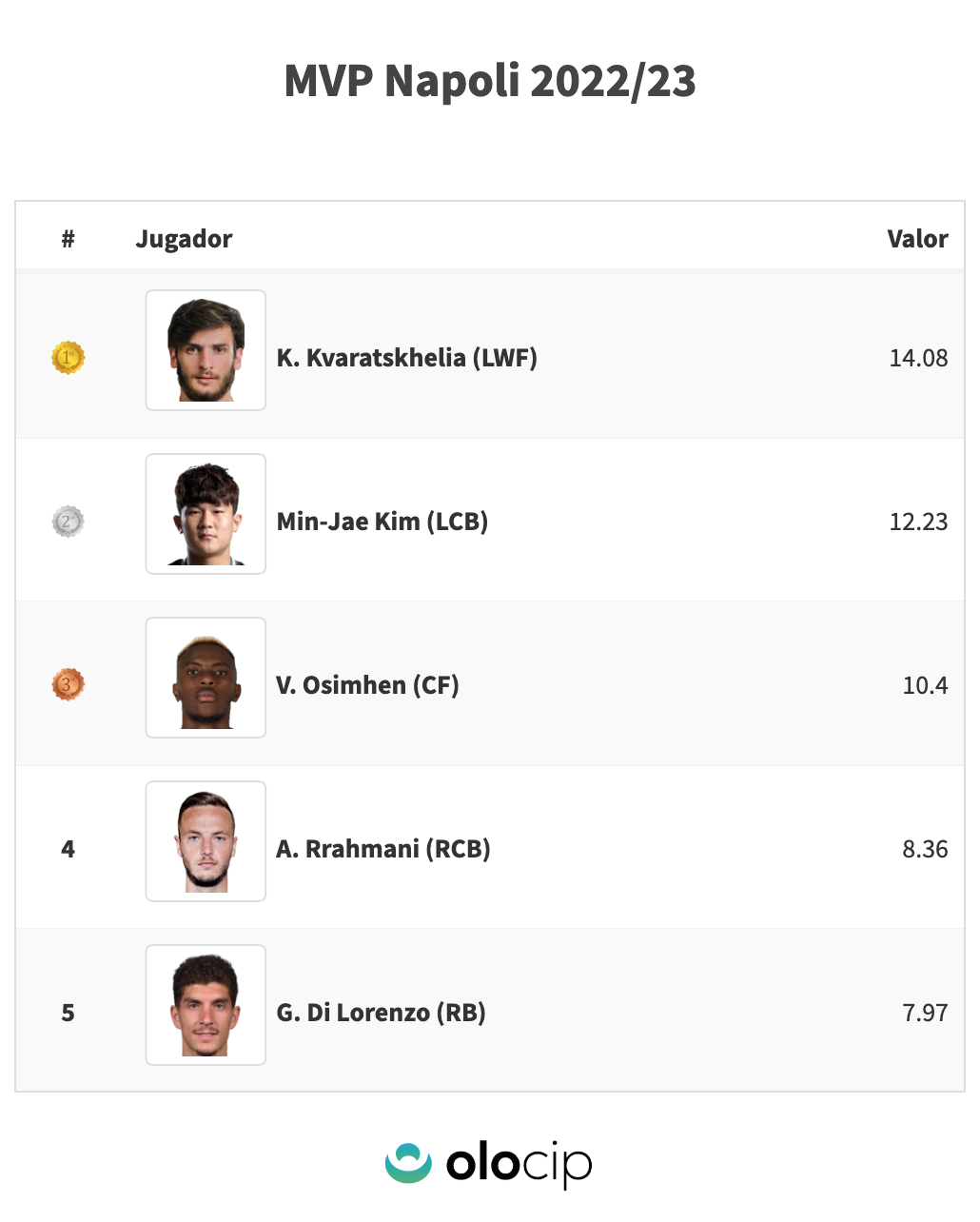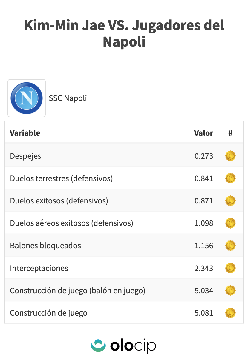 A un nivel más granular y detallado, observamos como Kim Min-Jae es el jugador que más valor genera defensivamente en el actual campeón de competición italiana, el 3º en la Serie A y el 1º en cuanto a duelos defensivos (aéreos y terrestres), bloqueos e interceptaciones en el conjunto napolitano.