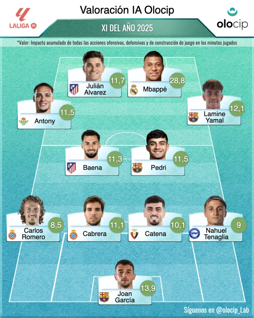Hasta tres jugadores del FC Barcelona, dos del Atlético de Madrid y RCD Espanyol y un futbolista de Real Madrid, Osasuna, Betis y Alavés forman la alineación de los mejores jugadores de 2025. Destaca muy por encima del resto Kylian Mbappé, que ha contribuido con sus acciones totales a que el Real Madrid haya generado 28,8 goles por encima de los esperados. El delantero del conjunto madridista ha generado más del doble de valor que el segundo jugador con mejor rendimiento de la competición española.