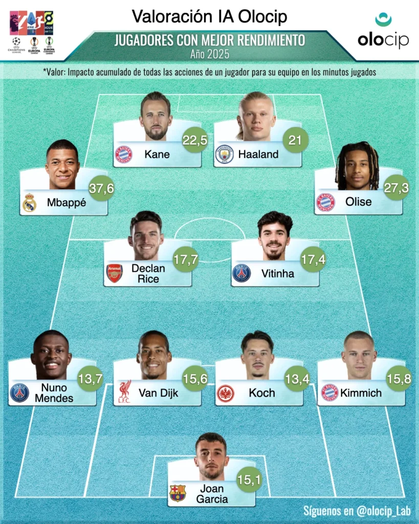 Para el análisis hemos tenido en cuenta las cinco ligas principales (Premier League, LaLiga, Serie A, Ligue 1 y Bundesliga), así como las principales competiciones europeas (Champions League, Europa League y Conference League). El XI de los mejores jugadores según la IA del 2025 está formado por Joan García (FC Barcelona) en portería; pareja de centrales formada por Van Dijk (Liverpool) y Koch (Eintracht) y Nuno Mendes (PSG) y Kimmich (Bayern) en los laterales. El centro del campo liderado por Declan Rice (Arsenal) y Vitinha (PSG); con Mbappé (Real Madrid) y Olise (Bayern) en los extremos. La punta de ataque la forman Kane (Bayern) y Haaland (Manchester City).