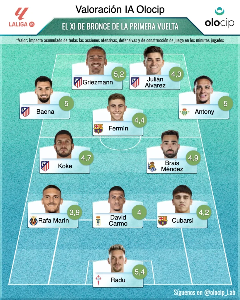 Por último, la alineación de bronce de la IA en las primera 19 jornadas disputadas está formada por Radu (RC Celta) en portería, protegido por una defensa de tres con Pau Cubarsí (FC Barcelona), David Carmo (Real Oviedo) y Rafa Marín (Villarreal) como centrales. En el mediocampo, Brais Méndez (Real Sociedad), Koke (Atlético de Madrid) y Fermín (FC Barcelona), con Antony (Real Betis) y Baena (Atlético de Madrid) en los extremos. En la delantera, la doble punta está formada por Julián Álvarez (Atlético de Madrid) y Griezmann (Atlético de Madrid)).