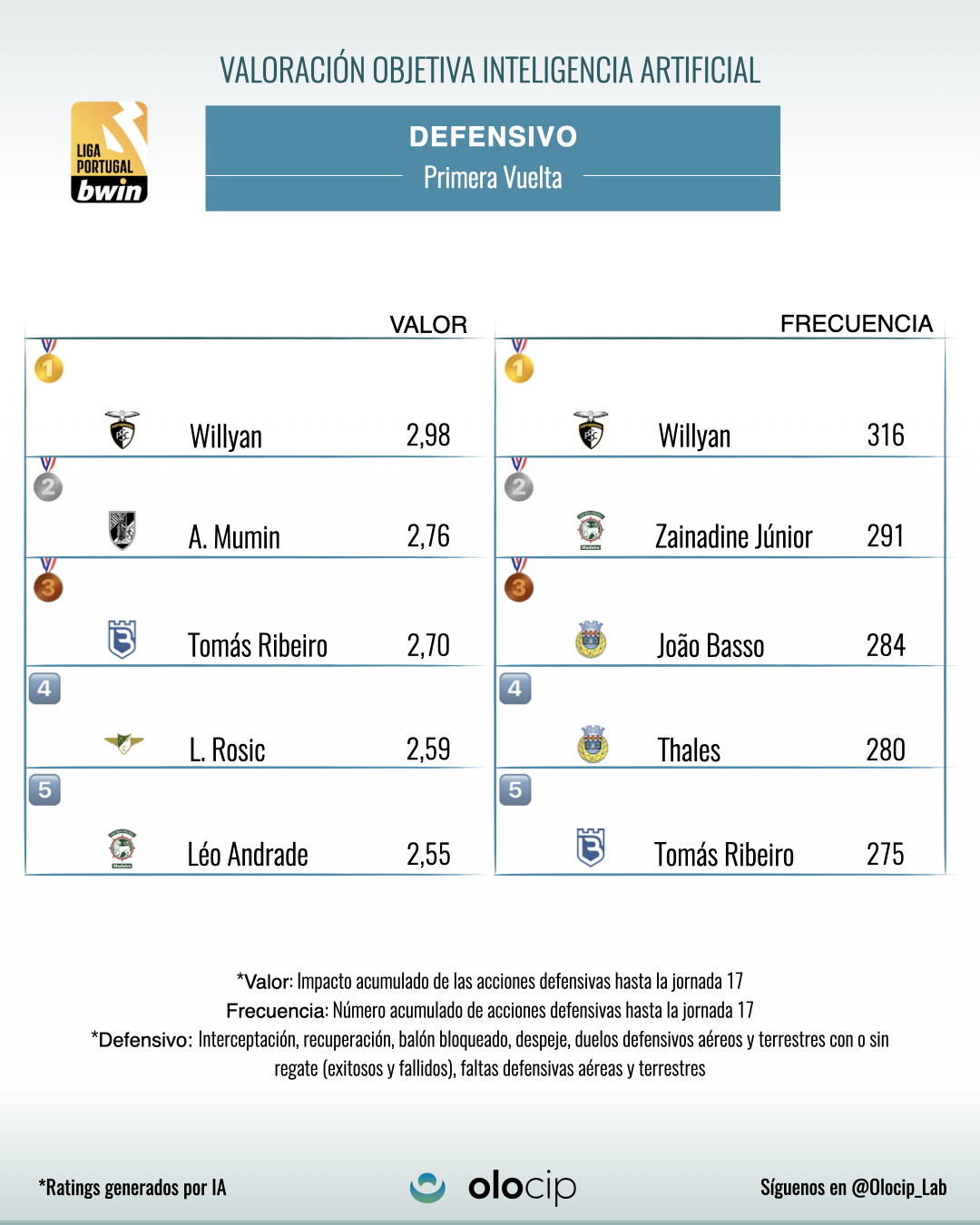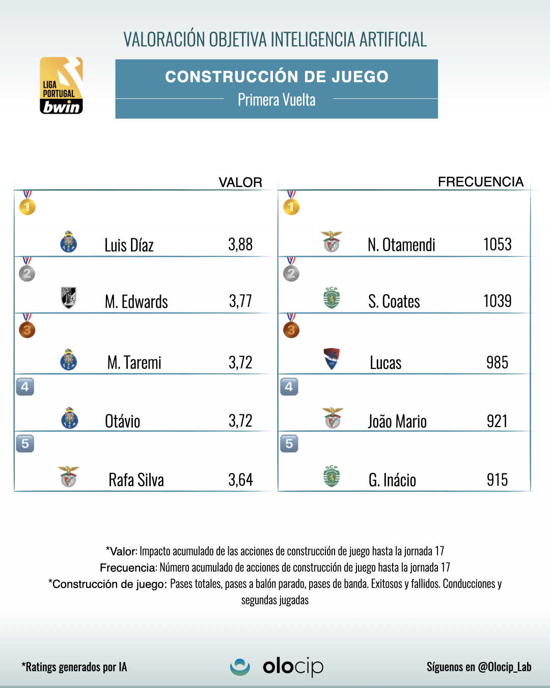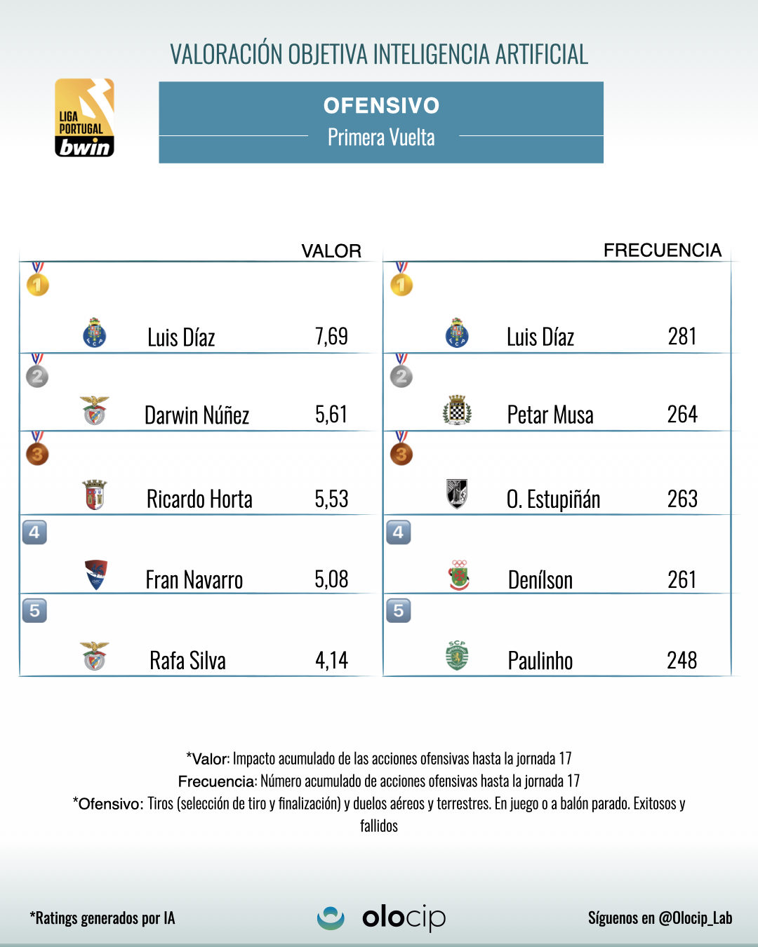 El centrocampista del Porto, Luis Díaz, es el jugador con mayor valor acumulado con sus acciones y por tanto el MVP de la primera vuelta de la Primeira Liga. El colombiano de 25 años ha generado un valor acumulado de +11,84 (7,69 ofensivo + 3,87 construcción de juego + 0,28 defensivo) en 1389’ minutos disputados.
