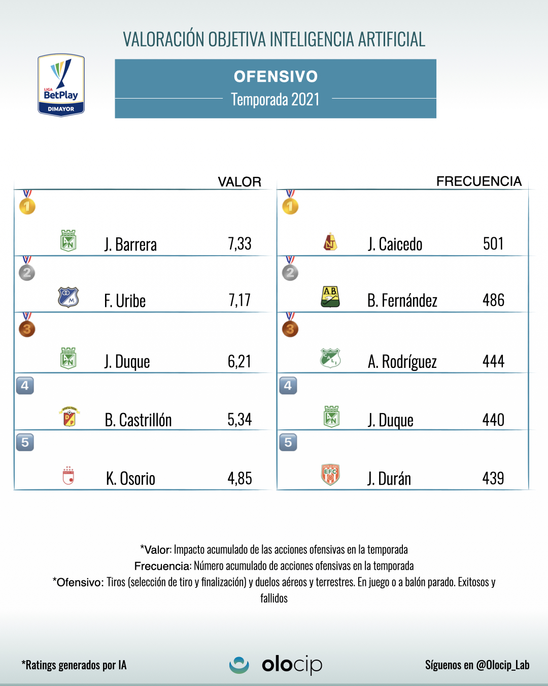 En este sentido, se observa que no por realizar más cantidad de acciones un jugador tiene más impacto en el juego. Por ejemplo, Barrera es el jugador del la liga colombiana que más impacto ofensivo ha acumulado; sin embargo, ni siquiera aparece en el top-5 de jugadores que más volumen de acciones ofensivas han llevado a cabo.