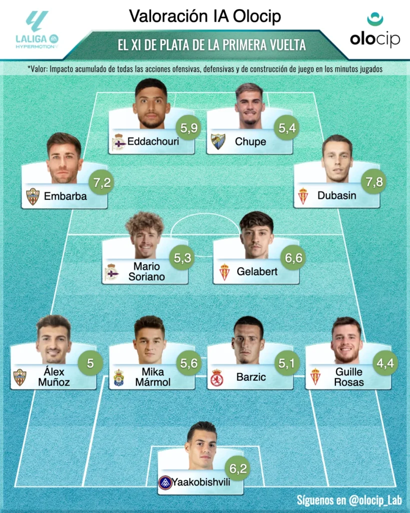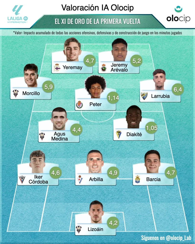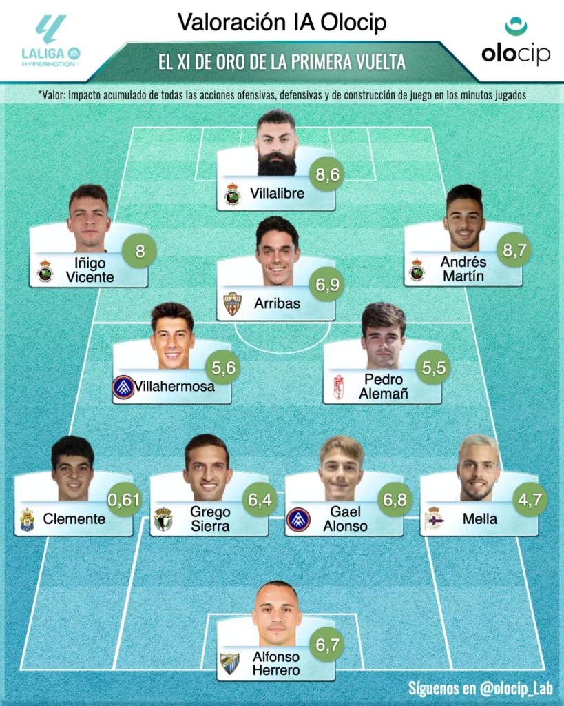 Con 21 jornadas transcurridas y alcanzada la primera mitad de la temporada de la Segunda División española, es el momento oportuno para examinar el desempeño de los jugadores y extraer las primeras conclusiones acerca de quiénes han destacado en el terreno de juego. En Olocip, empleamos la inteligencia artificial para ir más allá, superando las estadísticas tradicionales en el fútbol (big data). En lugar de basarnos únicamente en la cantidad de acciones, nuestro modelo de inteligencia artificial (IA) se enfoca en evaluar la calidad de dichas acciones. ¿Qué implica esto? No nos limitamos a recopilar datos; estamos analizando el valor de cada acción en el contexto del juego.
