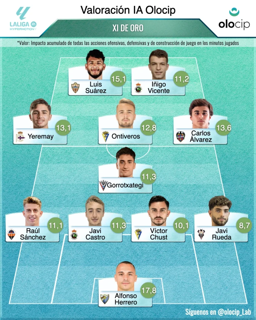El XI de los mejores jugadores de Segunda División está formado por Alfonso Herrero (Málaga) en portería, Javi Castro (Real Racing) y Víctor Chust (Cádiz) como centrales y laterales para Raúl Sánchez (Castellón) y Javi Rueda (Albacete). El centro del campo lo dirigen Gorrotxategi (Mirandés); con una mediapunta de tres jugadores como Carlos Álvarez (Levante), Yeremay (Deportivo de la Coruña) y Ontiveros (Cádiz). La punta de ataque es para Iñigo Vicente (Racing de Santander) y Luis Suárez (Almería).