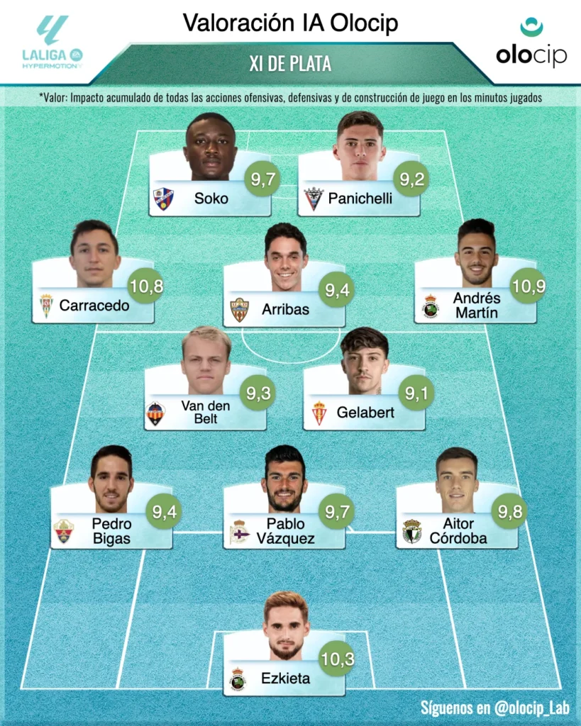 Terminada la temporada regular en la Liga Hypermotion, ya se puede evaluar a los jugadores que más están destacando en las 42 jornadas disputadas. Para conocer a los mejores jugadores de Segunda División, la inteligencia artificial evalúa el rendimiento de los futbolistas en función del impacto que han tenido con sus acciones en los minutos jugados. Las acciones se miden en base al cambio en la probabilidad de marcar o encajar gol del equipo cuando se realizan las acciones. Se contemplan variables ofensivas, defensivas y de construcción de juego.