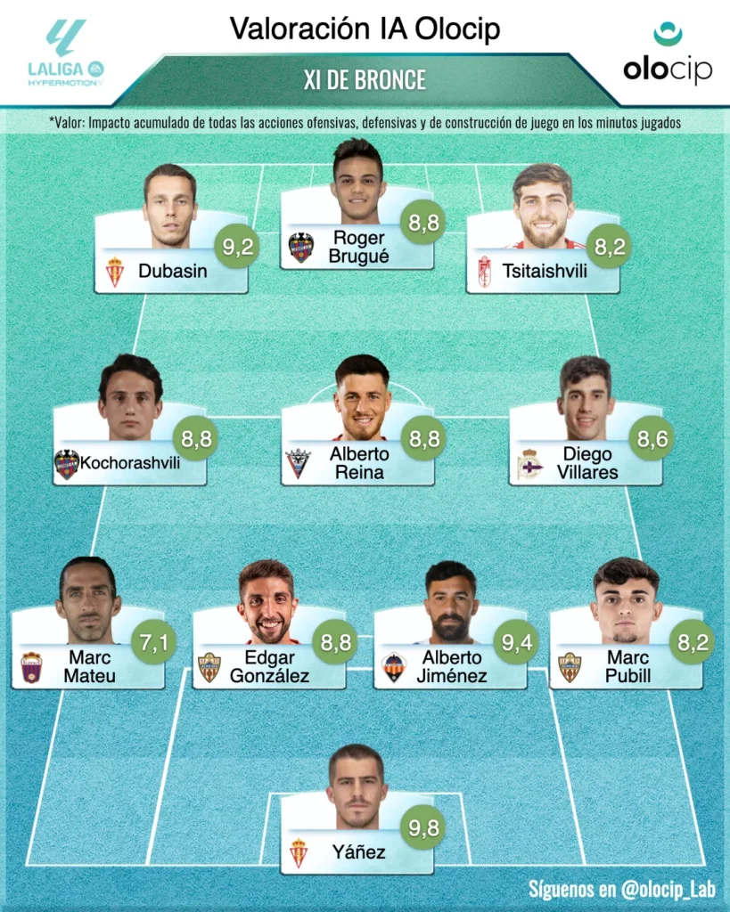 Por último, la alineación de bronce de los mejores jugadores de la Liga Hypermotion está conformada por el portero Yáñez (Sporting de Gijón). La defensa de 4 con  Edgar González (Almería) y Alberto Jiménez (Castellón) en el eje de la zaga, y Marc Mateu (Eldense) y Marc Pubill (Almería) en los laterales. El centro del campo dirigido por Kochorashvili (Levante), Alberto Reina (Mirandés) y Diego Villares (RC Deportivo). El ataque estaría formado por Tsitaishvili (Granada) y Dubasin (Sporting de Gijón) en los costados, con Roger Brugué (Levante)en punta.